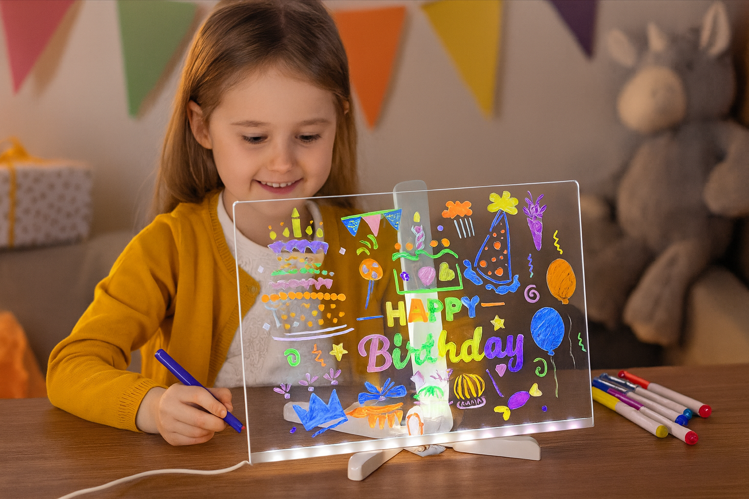 Le pack comprend : 1 tablette Brillocrea, 1 support réglable, 1 câble d’alimentation, 1 chiffon en microfibre et 7 crayons magiques offerts.